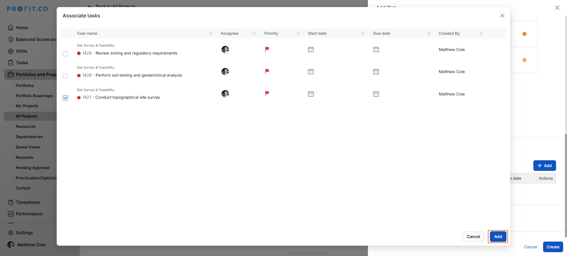 - Choose the relevant tasks. Tasks associated with risks are used for mitigation purposes, helping to prevent or reduce the likelihood of those risks occurring.