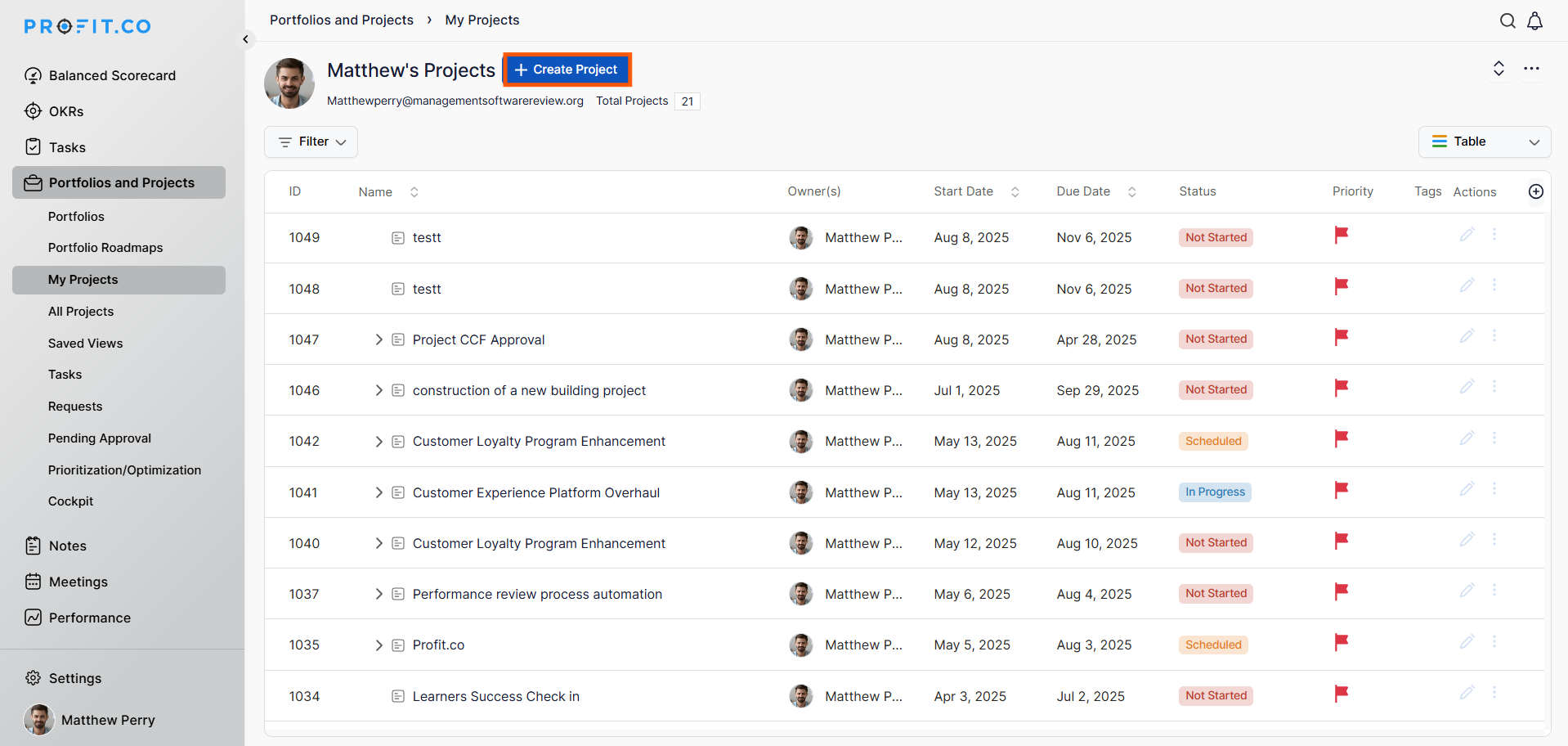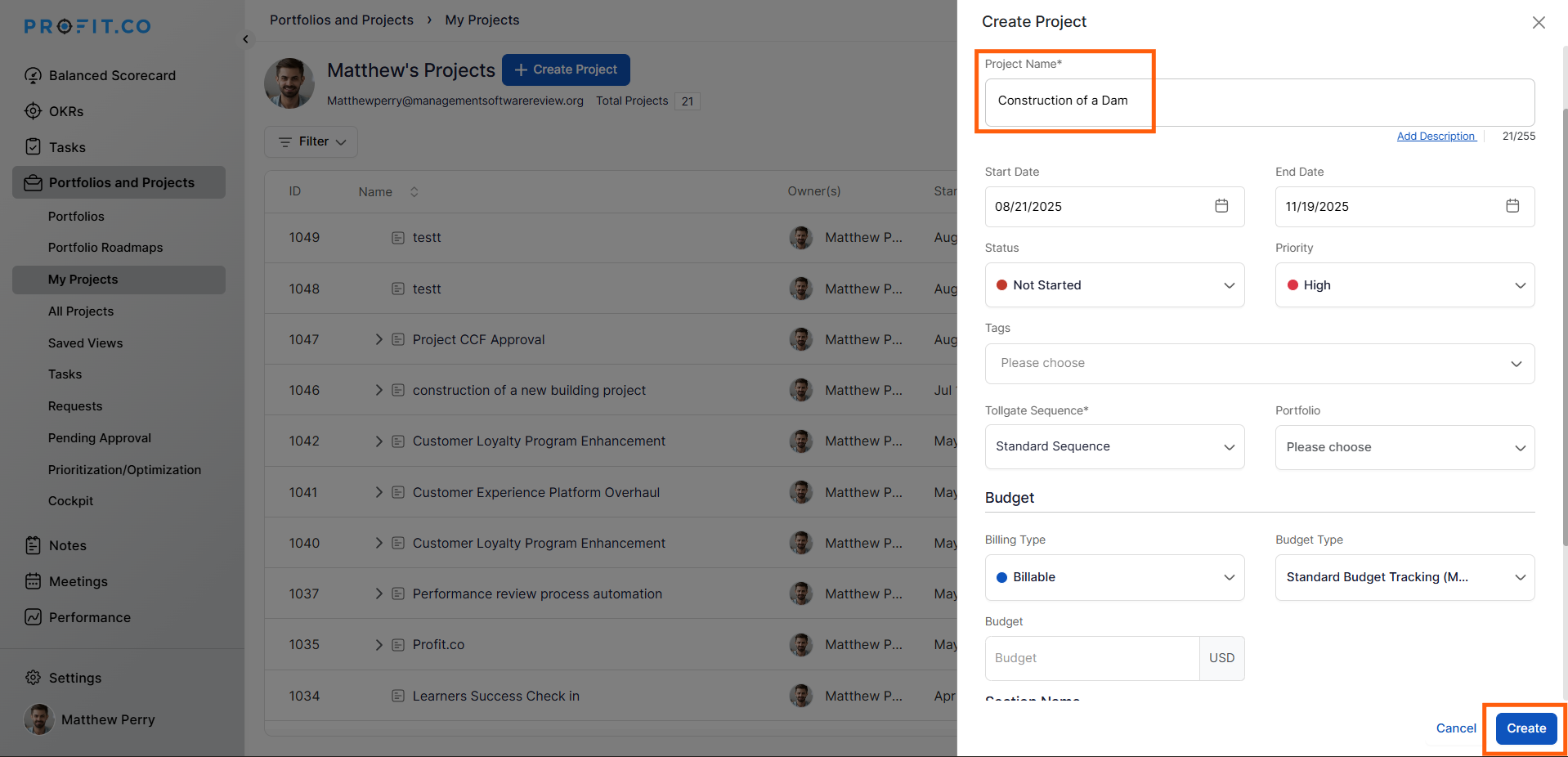 Navigate to Portfolios and Projects → My Projects → Create Project from the left navigation panel.