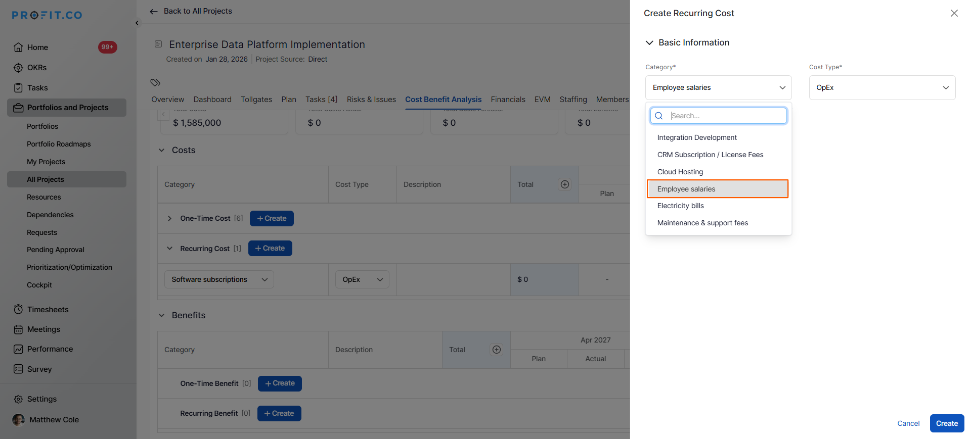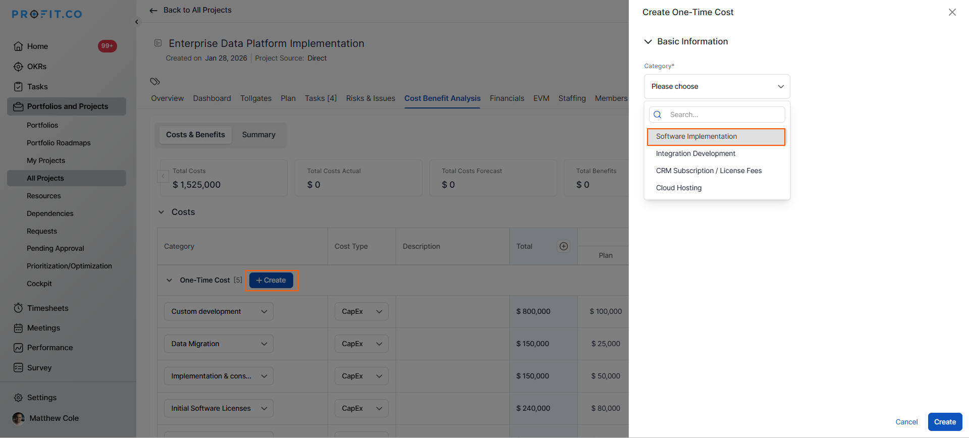 Profit.co supports multiple cost Types for comprehensive planning: