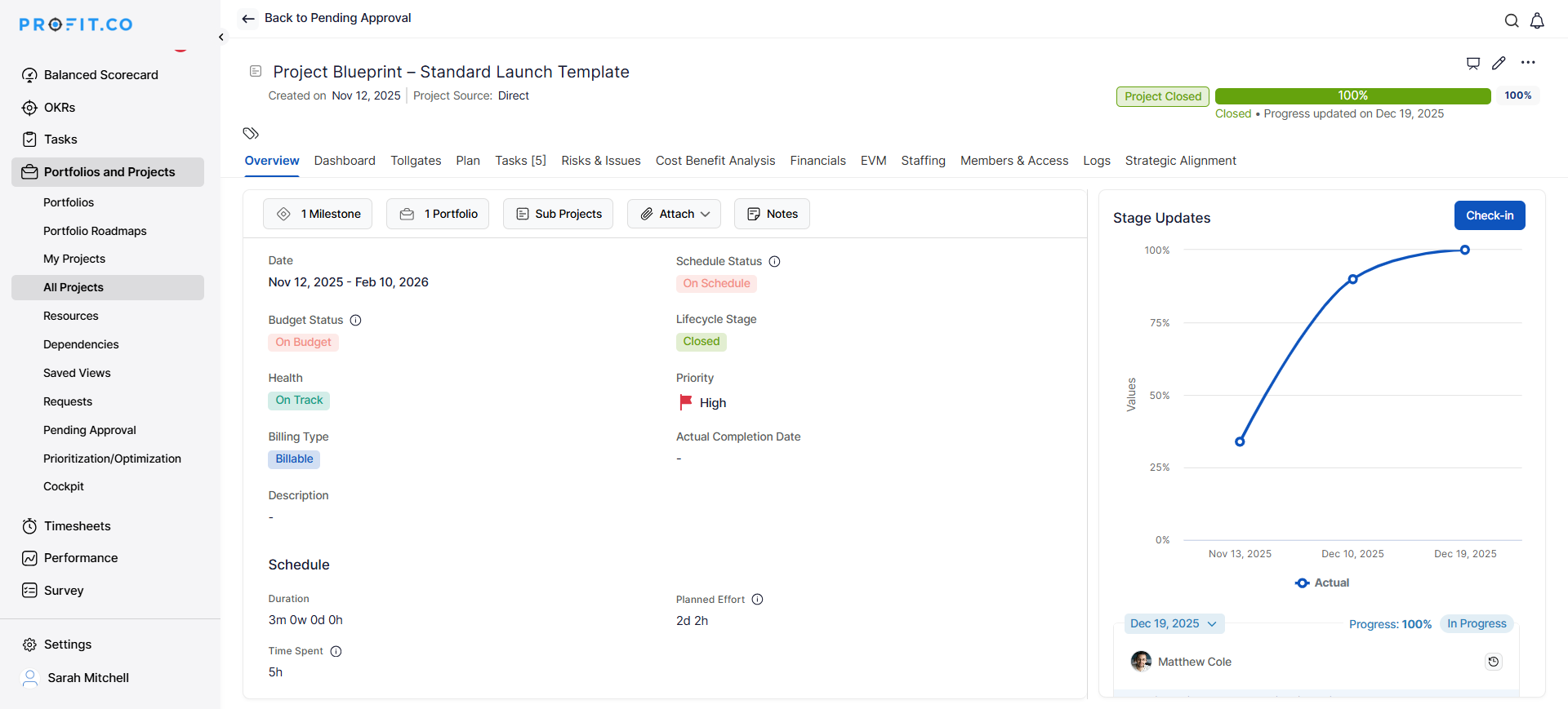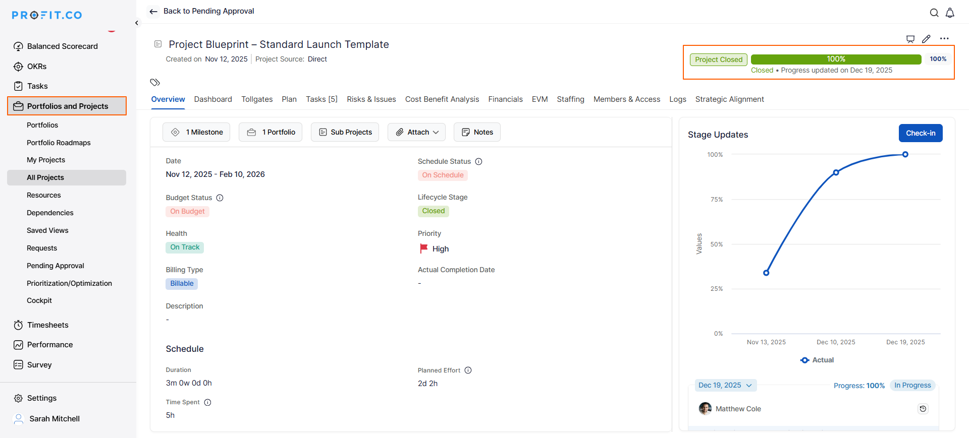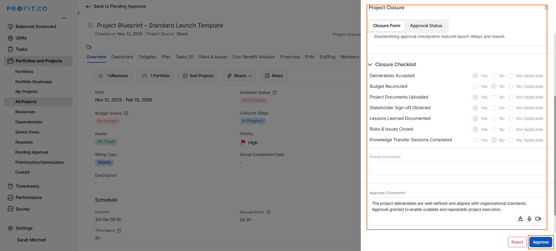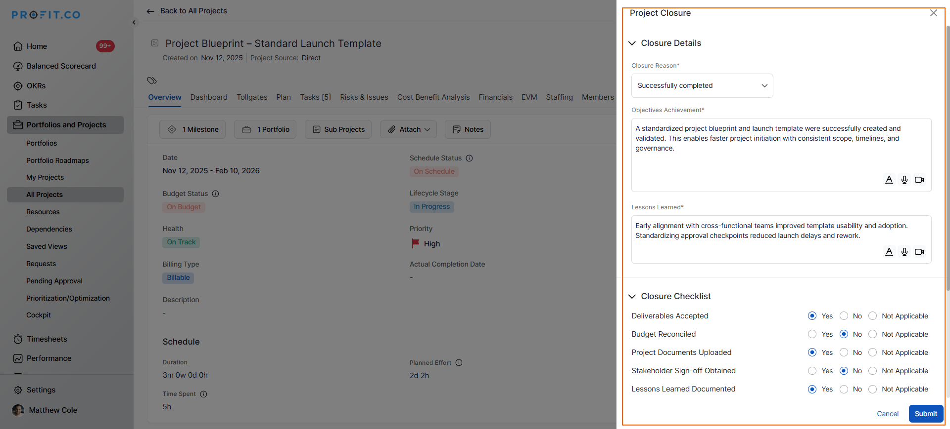 Profit.co provides a comprehensive Project Closure feature that enables structured project endings with achievement documentation, lessons learned capture, and closure checklist. This ensures projects close properly with valuable insights preserved for future reference, transforming project endings from informal wrap-ups into strategic knowledge management opportunities.