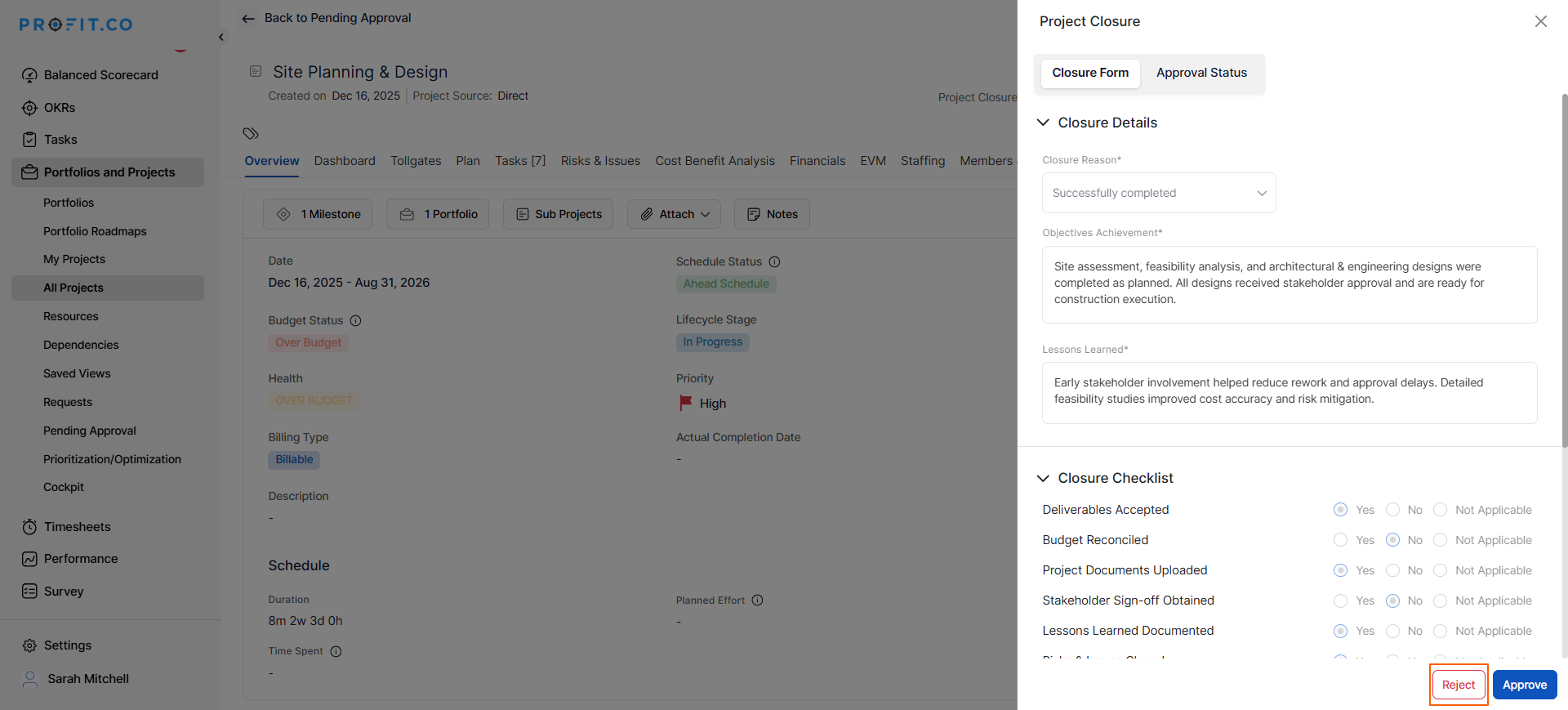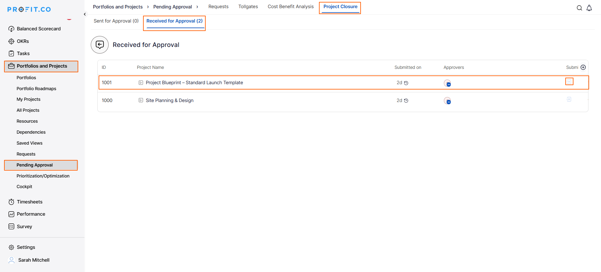 - In the Pending Approval page, switch to the Project Closure tab