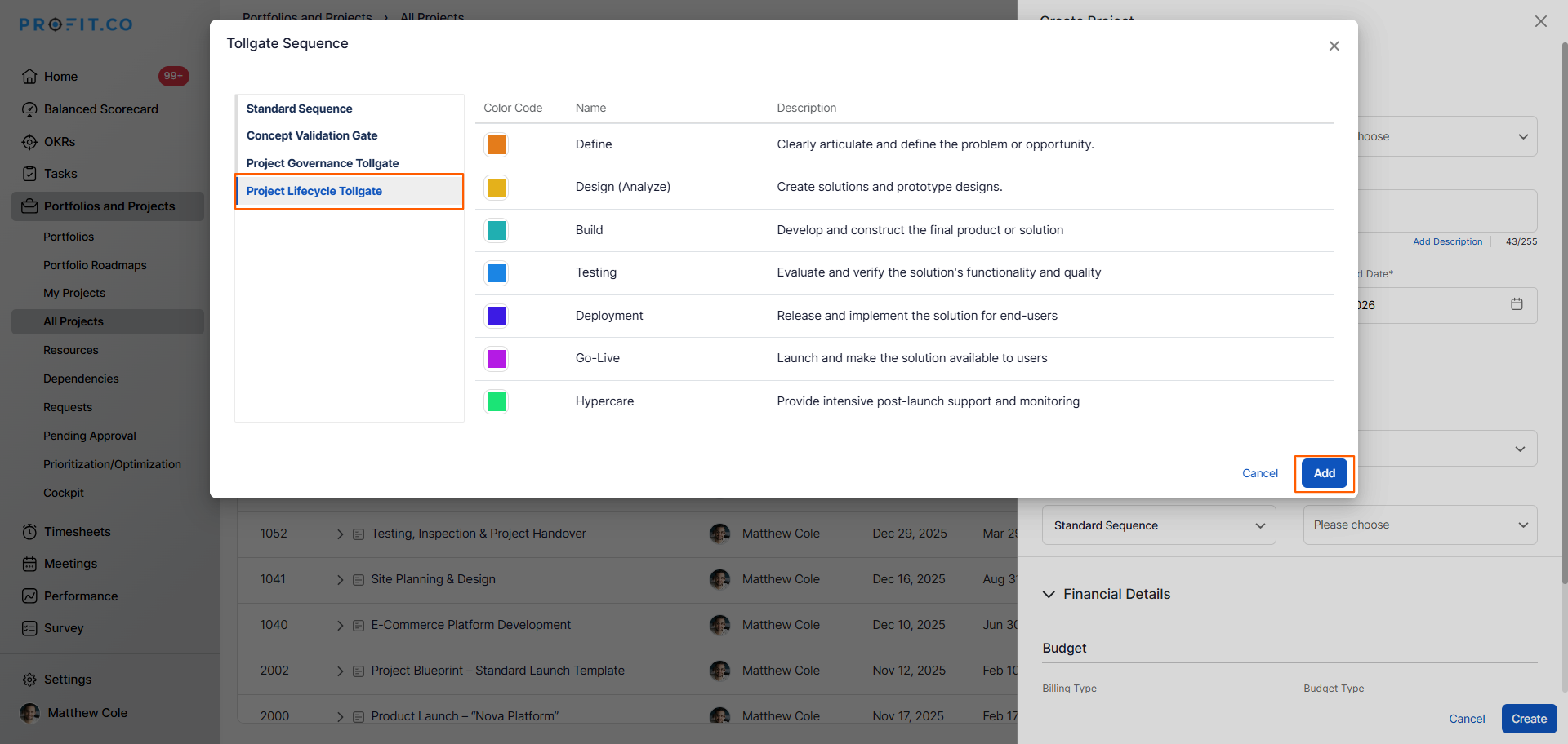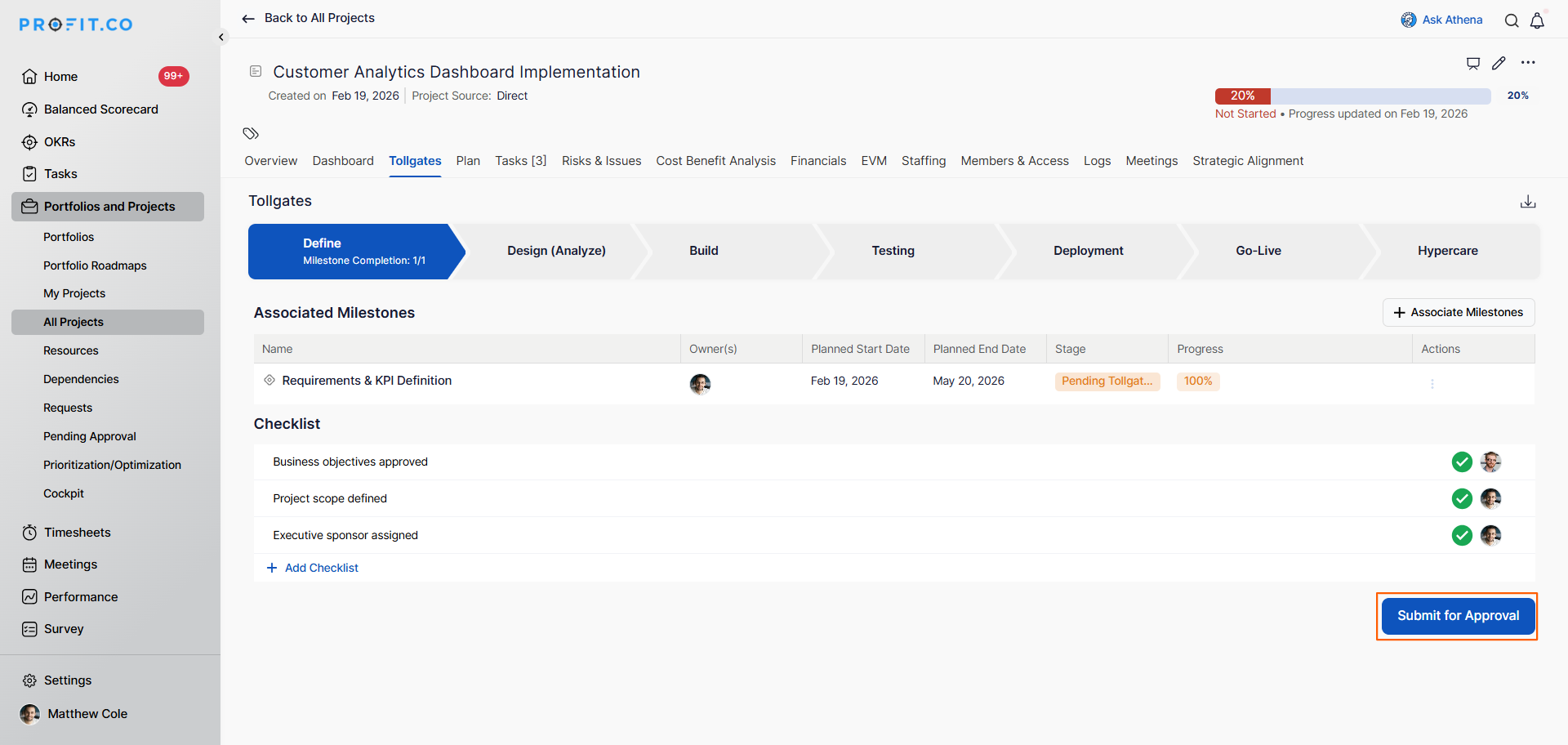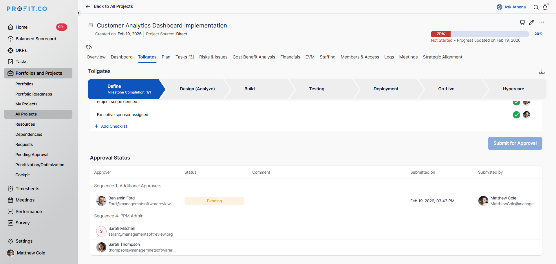 In Profit.co, you can Manage tollgate compliance across projects by associating tollgate sequences with projects, linking milestones to tollgate stages, managing checklists, and monitoring approval status, ensuring projects meet governance requirements before advancing to the next phase.