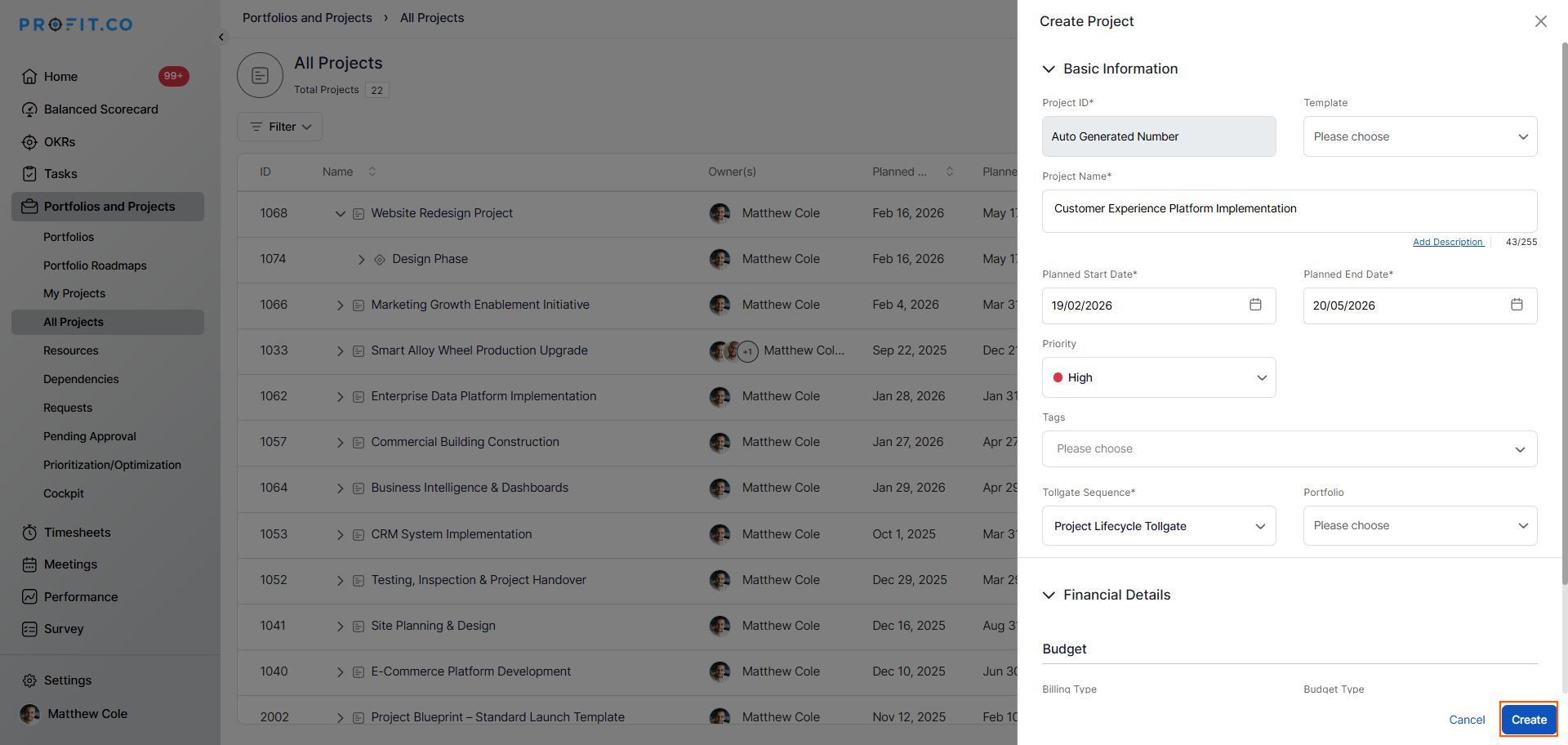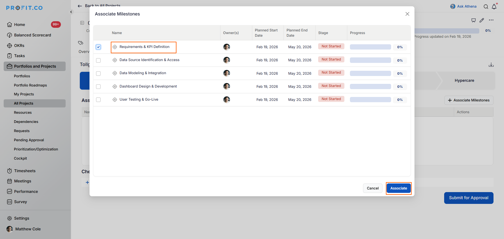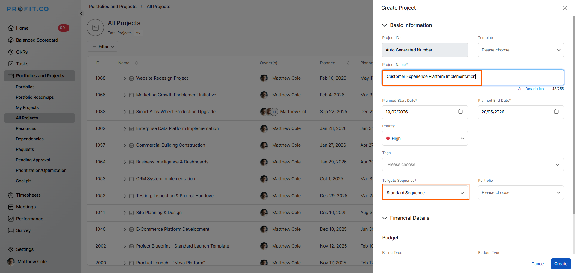 In Profit.co, you can Manage tollgate compliance across projects by associating tollgate sequences with projects, linking milestones to tollgate stages, managing checklists, and monitoring approval status, ensuring projects meet governance requirements before advancing to the next phase.