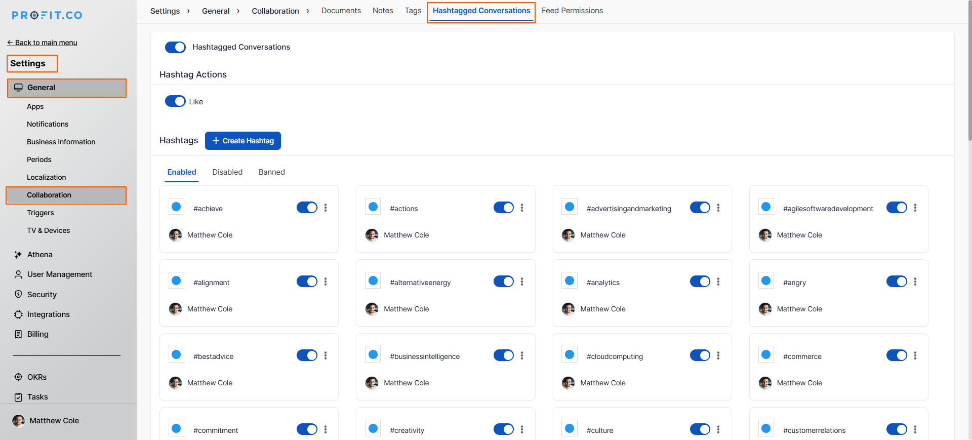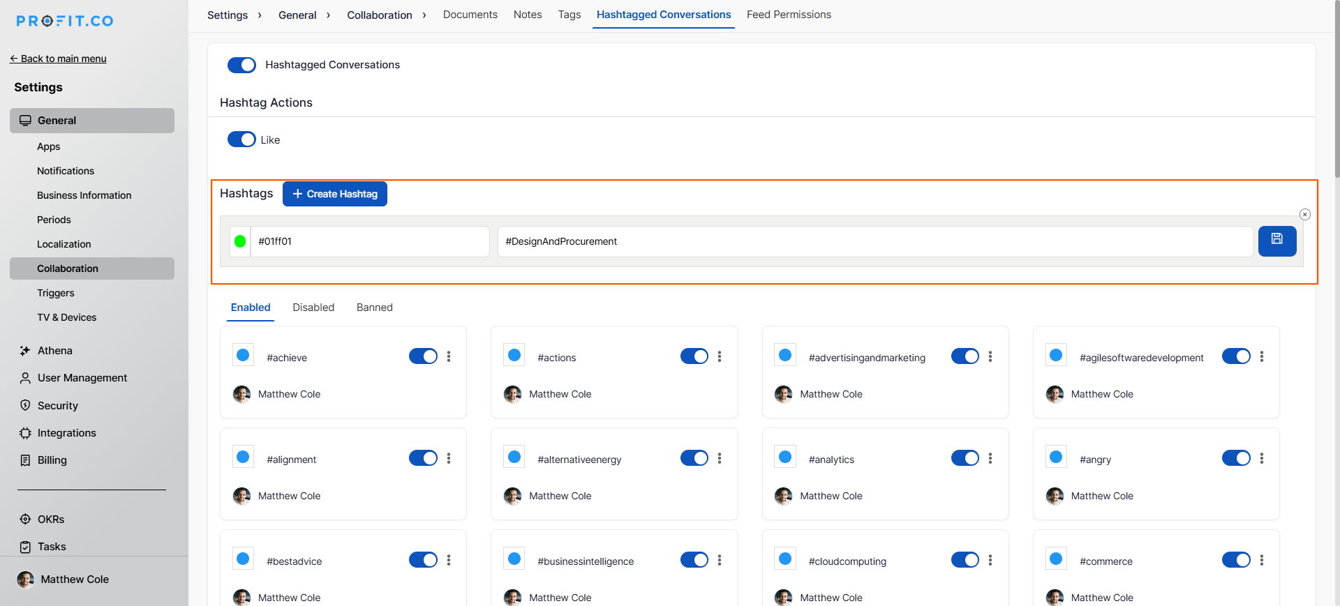 In Profit.co, hashtagged conversations allow you to organize and categorize discussions using customizable #hashtags with color coding, making it easier to track topics, collaborate with team members, and find related conversations across projects.