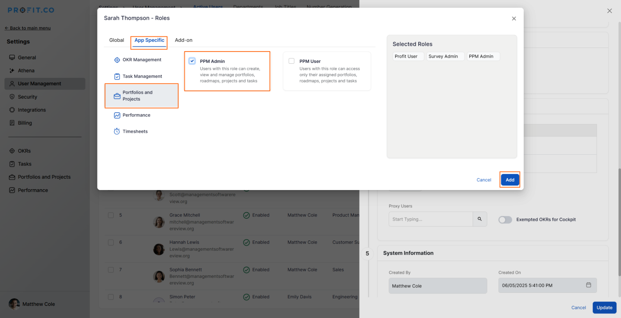 The PPM Admin role is a specialized administrative role in Profit.co that provides dedicated access to Project Portfolio Management settings without granting full system-wide Super User privileges.
