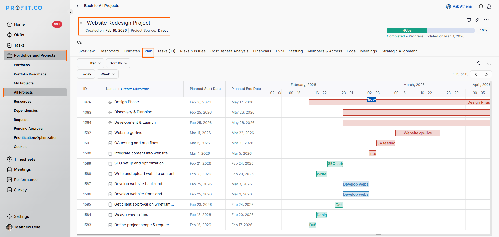 Profit.co calculates the critical path using two primary inputs from your project plan: