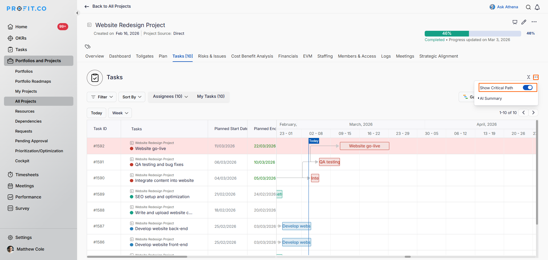 - Profit.co will automatically highlight the tasks that fall on the critical path.