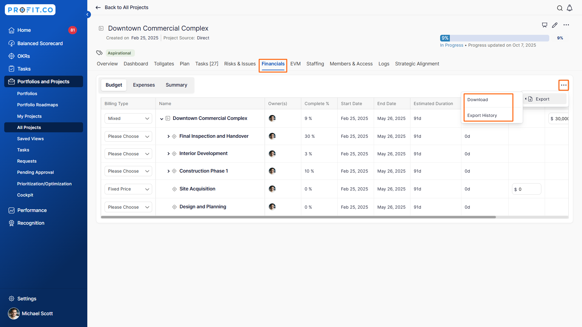 Note: You can now export data from the Budget tab. Use the Export/Download option to download project budgets and related financial details for offline review, reporting, or analysis. This helps streamline financial reviews and supports accurate data sharing for presentations.