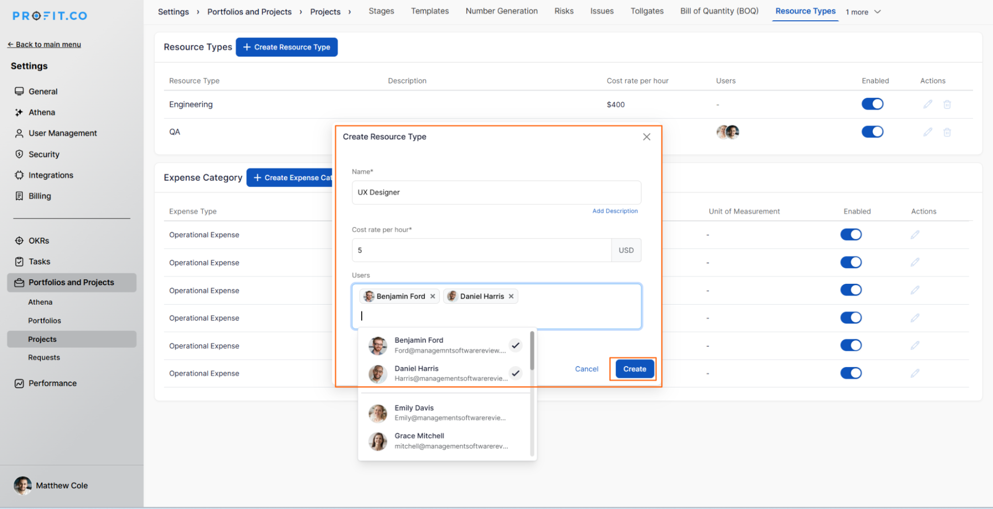 - Enter the following details: Resource Type Name, Cost Rate (per hour) Users to assign under this resource type