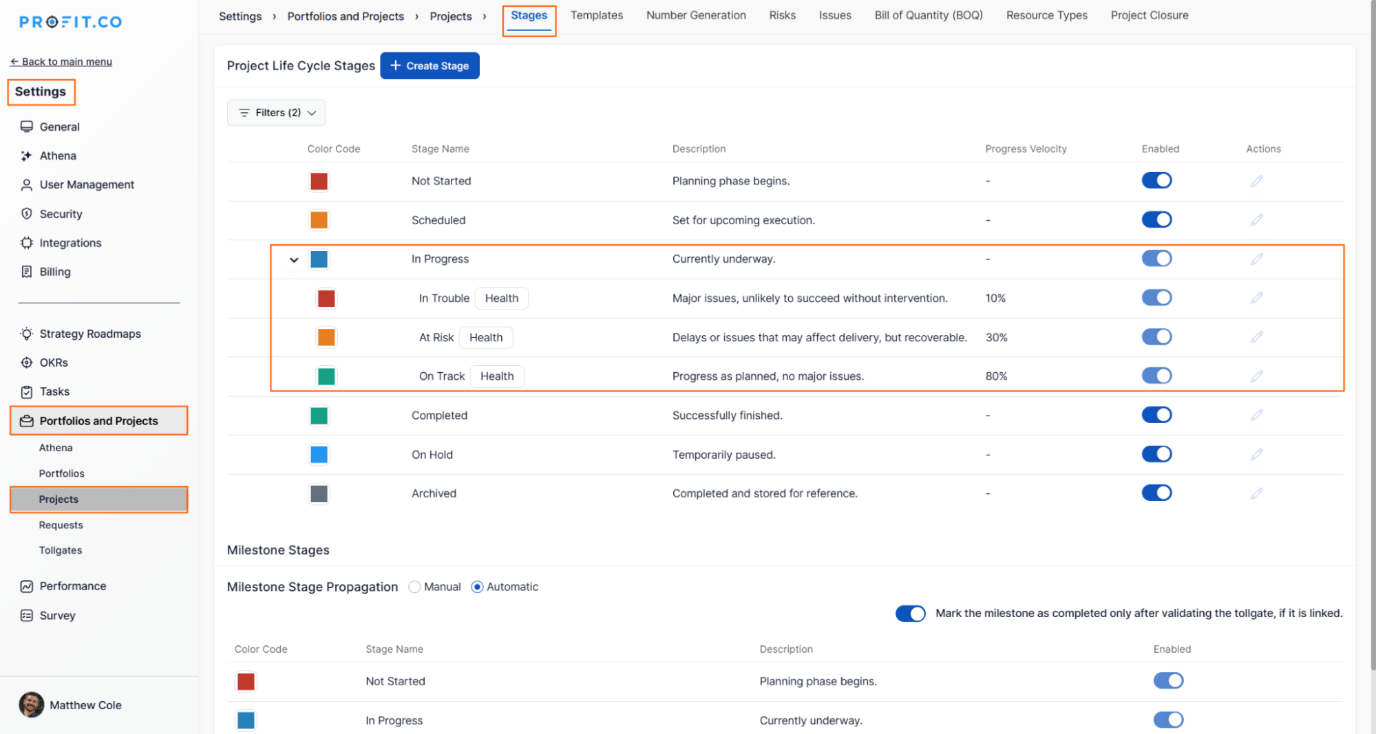 - Navigate to Settings → Portfolios and Projects → Projects → Stages.