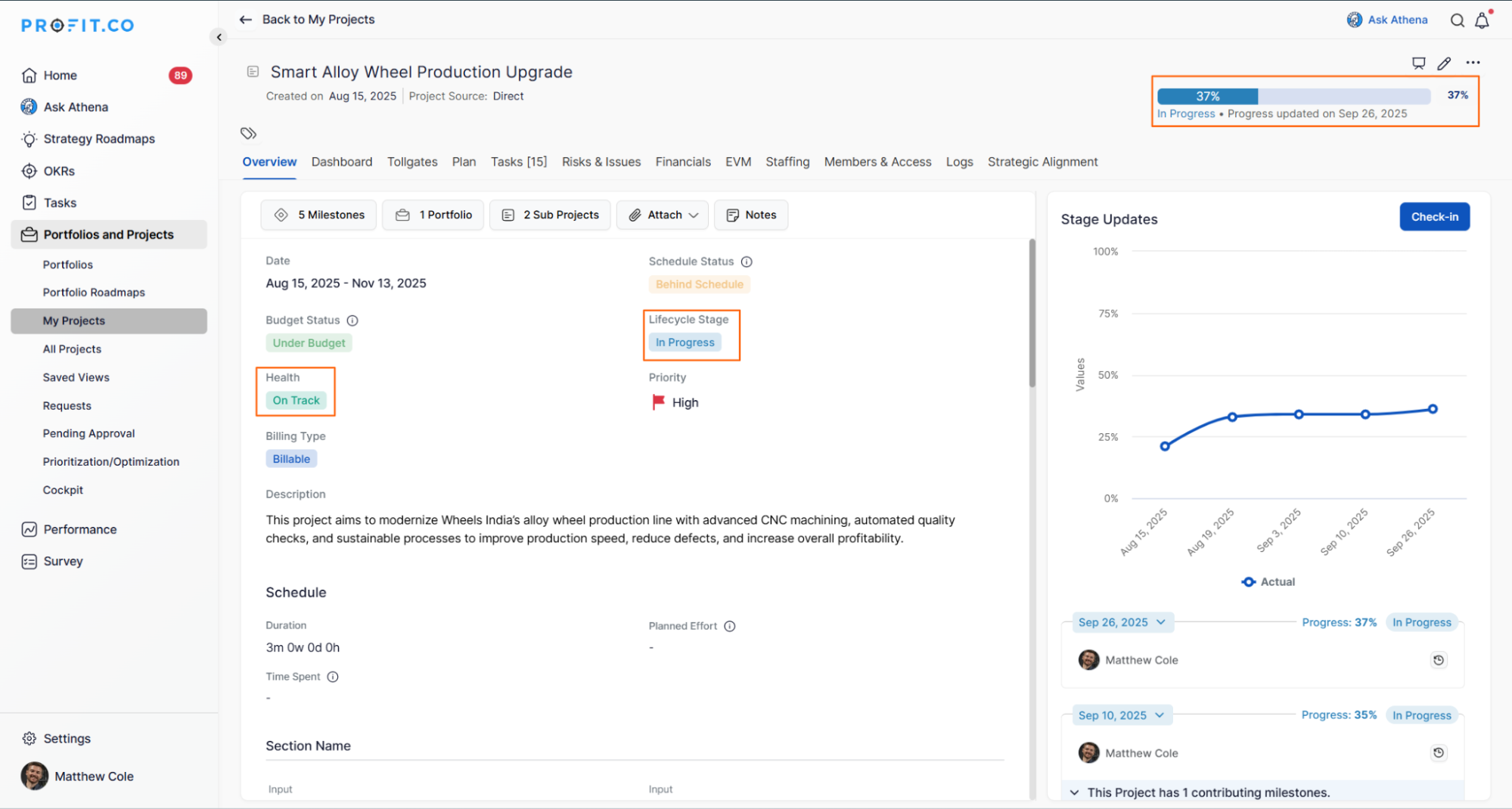 In the example below, the project is currently In Progress with 37% progress, and the Health Status shows On Track.