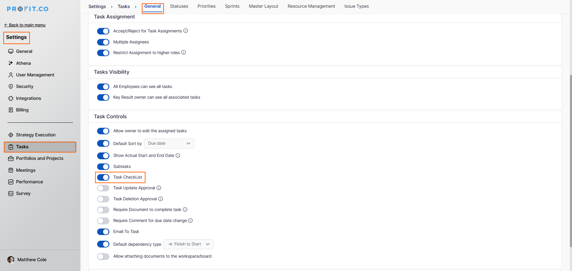 - Under the Task Controls section, enable the toggle for Task Checklist.