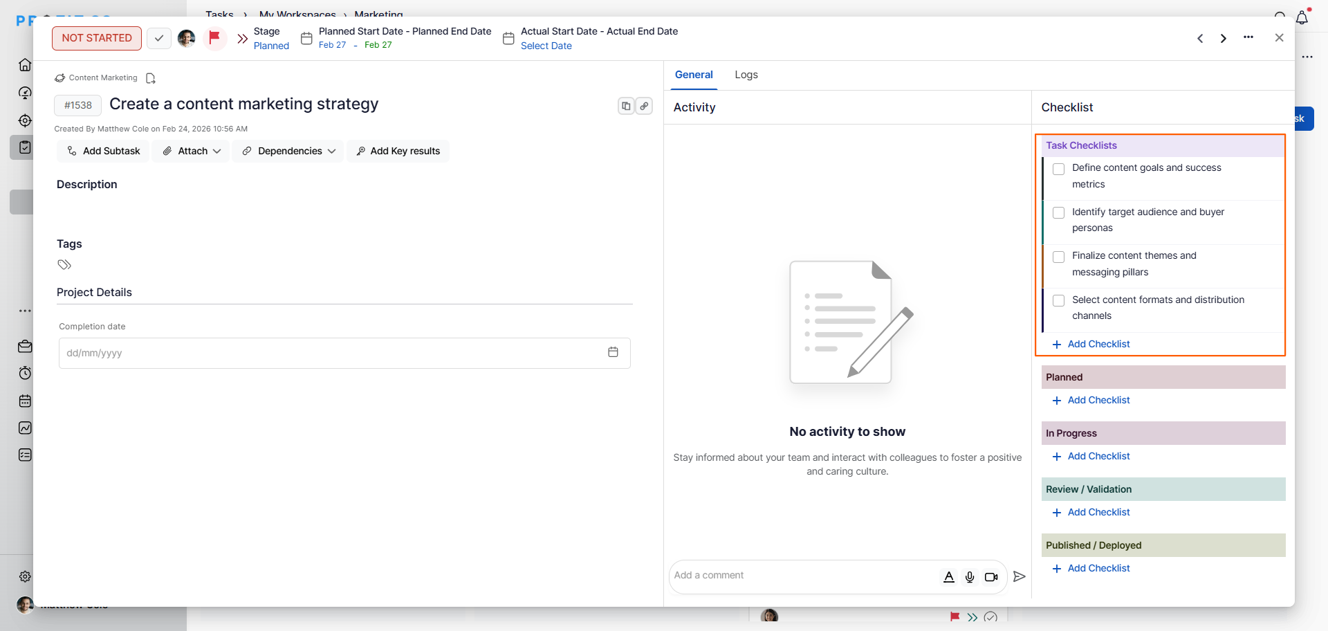 In Profit.co, users can add checklists individually to any task to define specific completion criteria, track step-by-step progress, and ensure consistency and completeness in how tasks are carried out.