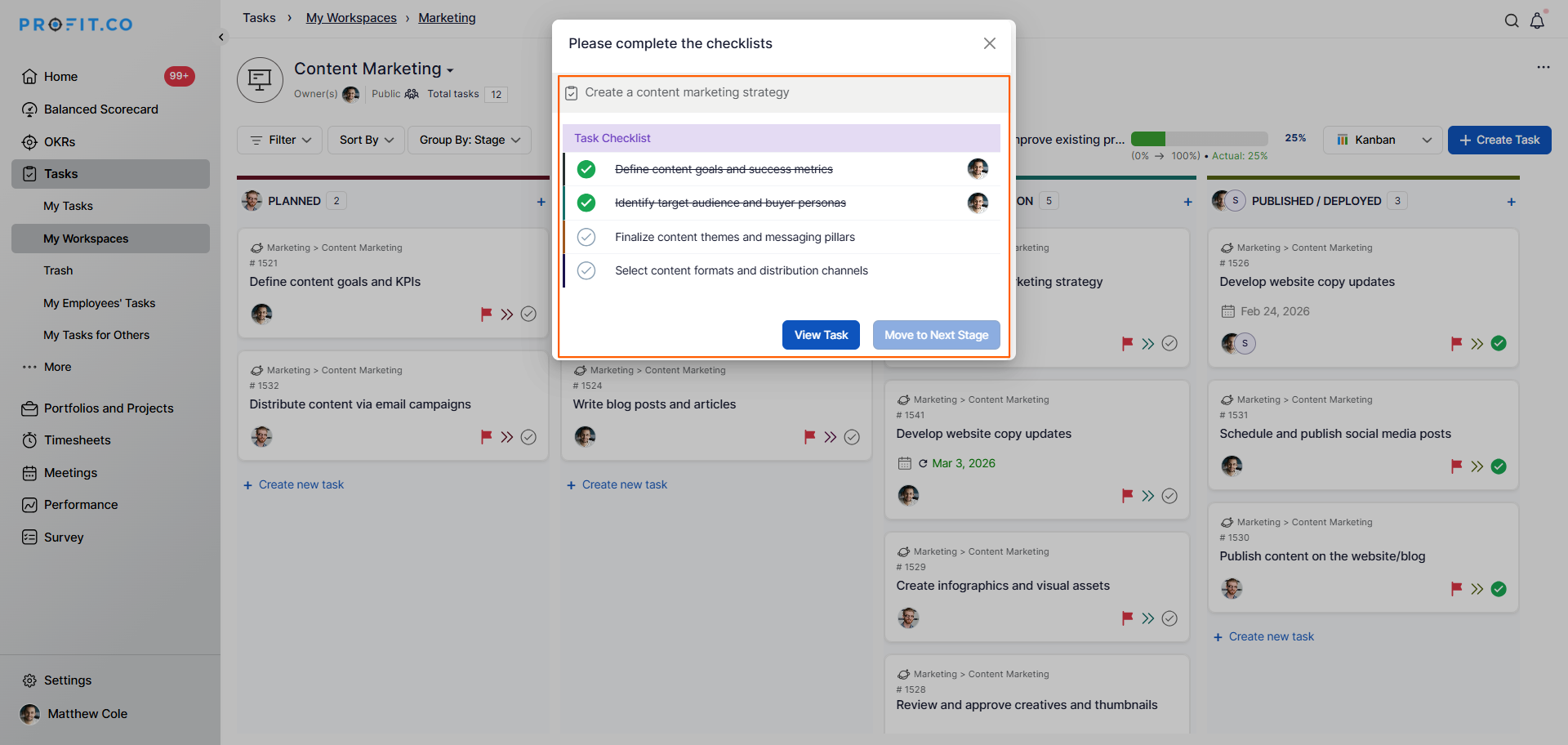A Task Checklist in Profit.co is an individual to-do list that can be added directly to a specific task to define the smaller steps or completion criteria required to finish that task. Each checklist item can be independently checked off as it is completed, giving users granular visibility into how much of the task's required work has been done. Unlike stage checklists that apply globally to all tasks in a board stage, task checklists are specific to individual tasks.
