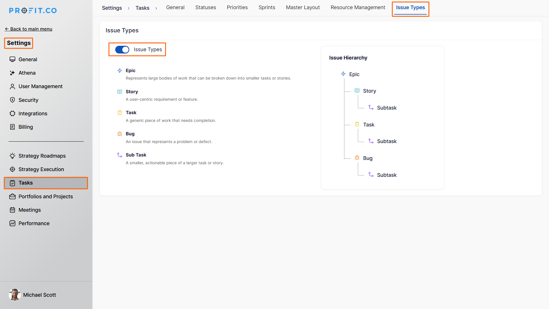 In Profit.co, issue types follow a clear parent - child relationship that helps teams organize work at different levels: