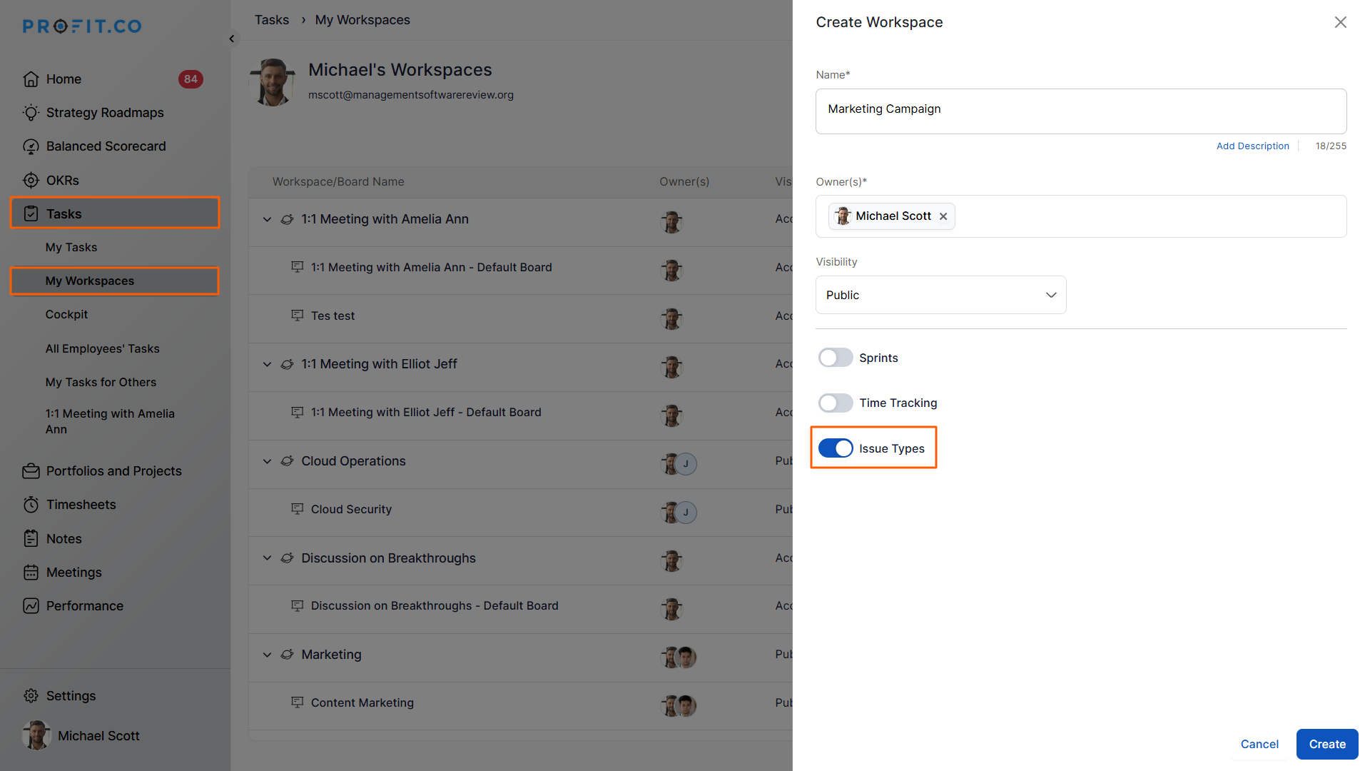 Note: At the Workspace level, enable the Issue Type toggle to ensure all Boards created under it support Issue Types.