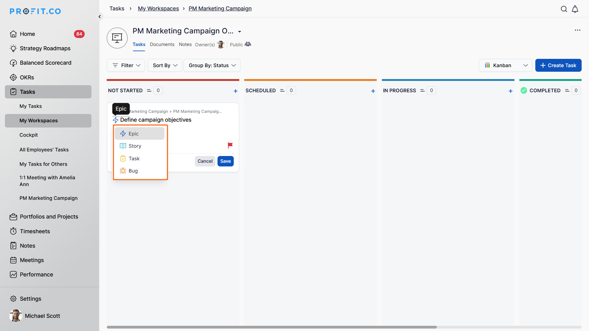 In Profit.co, you can use Agile Epics and User Stories to structure your work effectively. Epics represent big-picture goals, while Stories capture user needs. Tasks and Sub-tasks break those needs into actionable work, and Bugs highlight defects to be fixed. This layered structure ensures that every piece of work is connected back to business value.