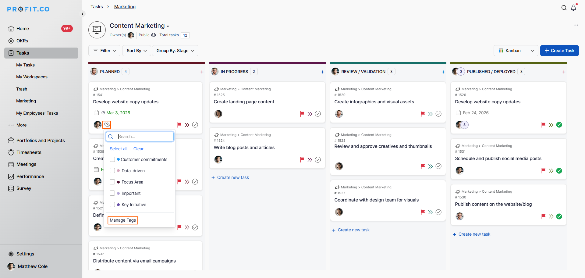 In Profit.co, you can add Tags to tasks to categorize, filter, and quickly locate them across any workspace or board, making task organization more flexible and efficient for your entire team.