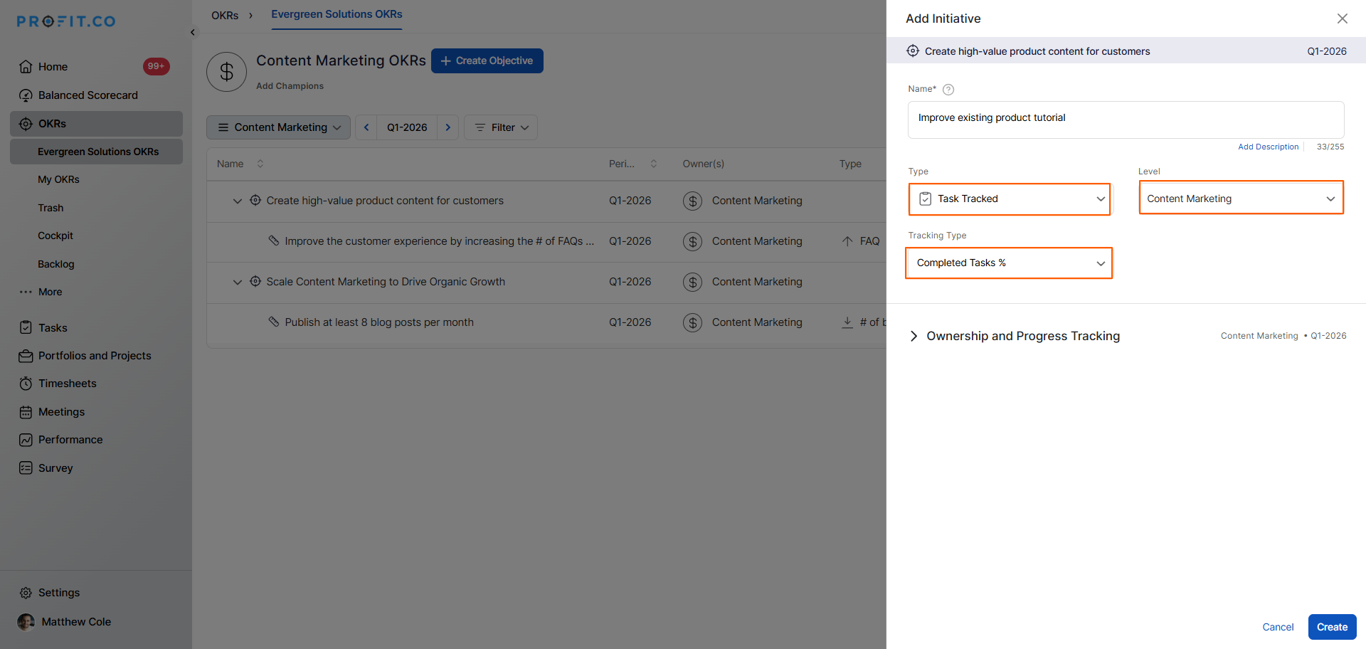 How to create a Task Tracked Key Result with Completed Task % in Profit.co?