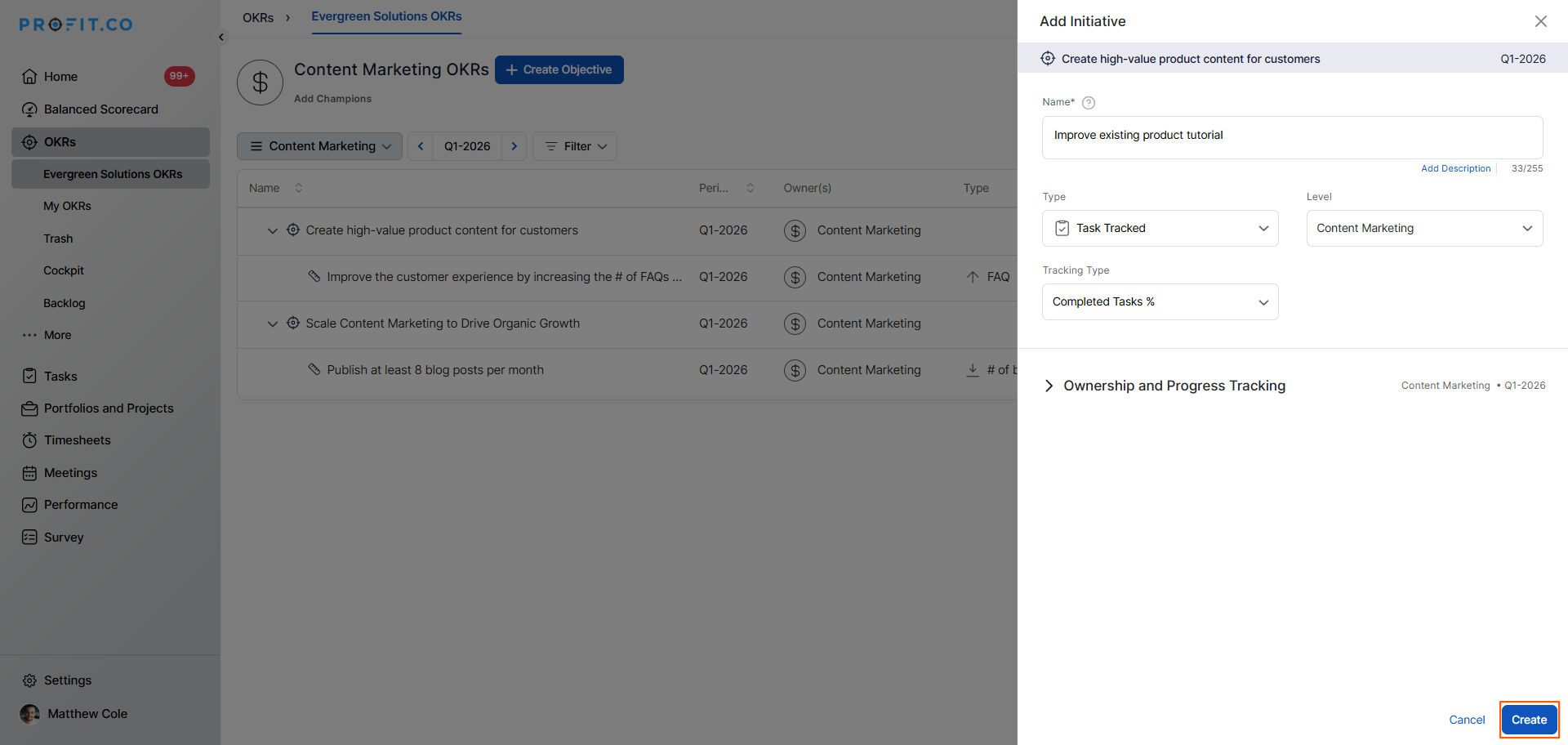 - Review all the details and click Create to save the Task Tracked Key Result.
