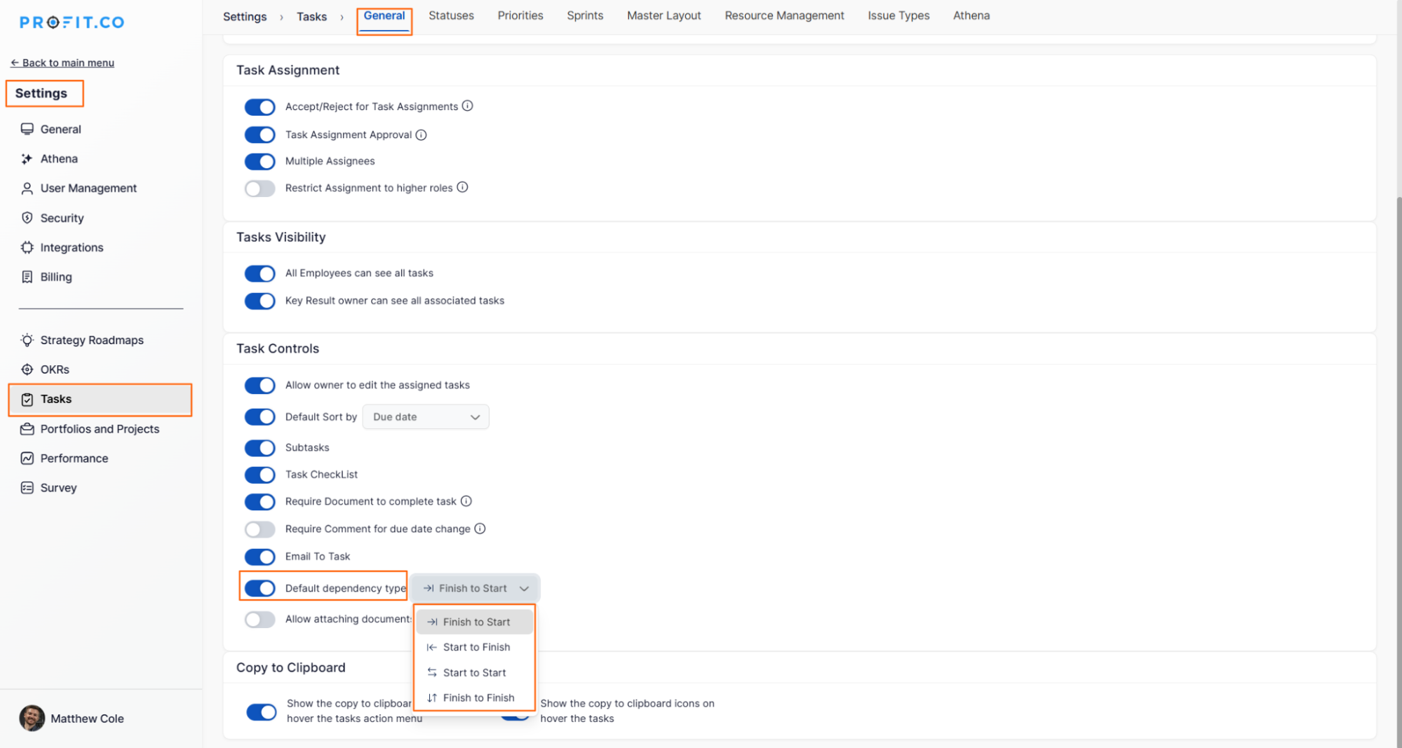 - Navigate to Settings→ Tasks → General → Default dependency type enable the toggle.