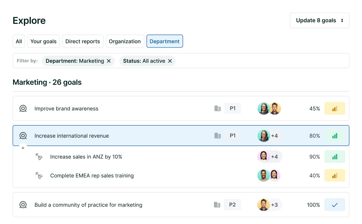 Best for: Organizations seeking AI-powered insights and tight integration between goal tracking and talent management.