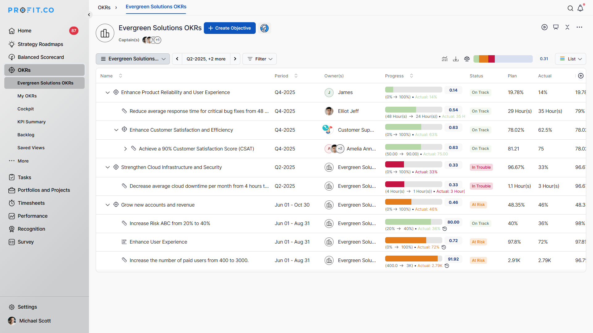 Profit.co has been recognized as a G2 Leader and featured in Gartner’s Hype Cycles. The platform stands out by integrating AI-powered OKR software with performance management, project portfolio management, and employee engagement in a single unified system.For enterprise teams, this integration eliminates the tool sprawl that often undermines strategy execution. Instead of jumping between separate systems for goal setting, performance reviews, and project tracking, everything is in one AI-enhanced ecosystem.