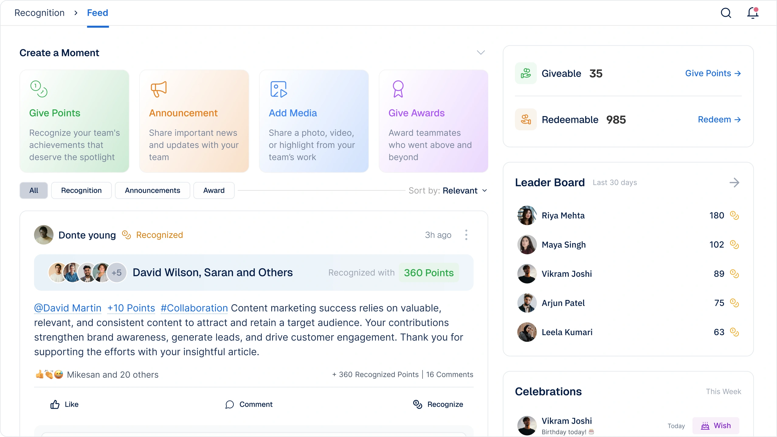See recognition posts, comments, and point exchanges in one live feed. Build momentum by showcasing wins publicly.